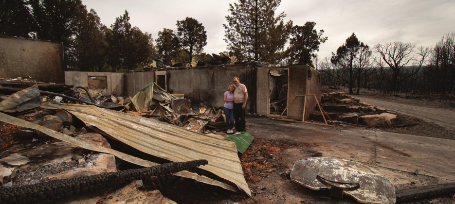 Amy and Rudy Stauffer stand in the rubble of their burned home in May 2022, after it was destroyed by the Simms Fire. Erin McIntyre – Ouray County Plaindealer