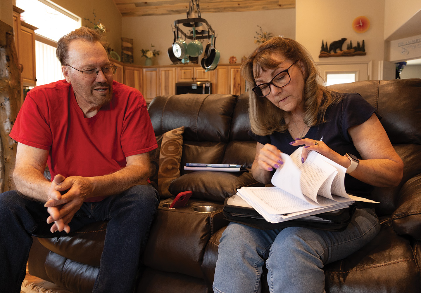 Rudy and Amy Stauffer look through more than 60 pages of a tort claim they filed with the federal government, asking for compensation from the fire that destroyed their home in 2022 after a prescribed burn set by the U.S. Forest Service turned into the Simms Mesa wildfire. They spent months of their own time and an estimated $5,000 to gather materials for the claim paperwork, and have not received any compensation yet. They have since rebuilt a new home on the old foundation. Erin McIntyre – Ouray County Plaindealer