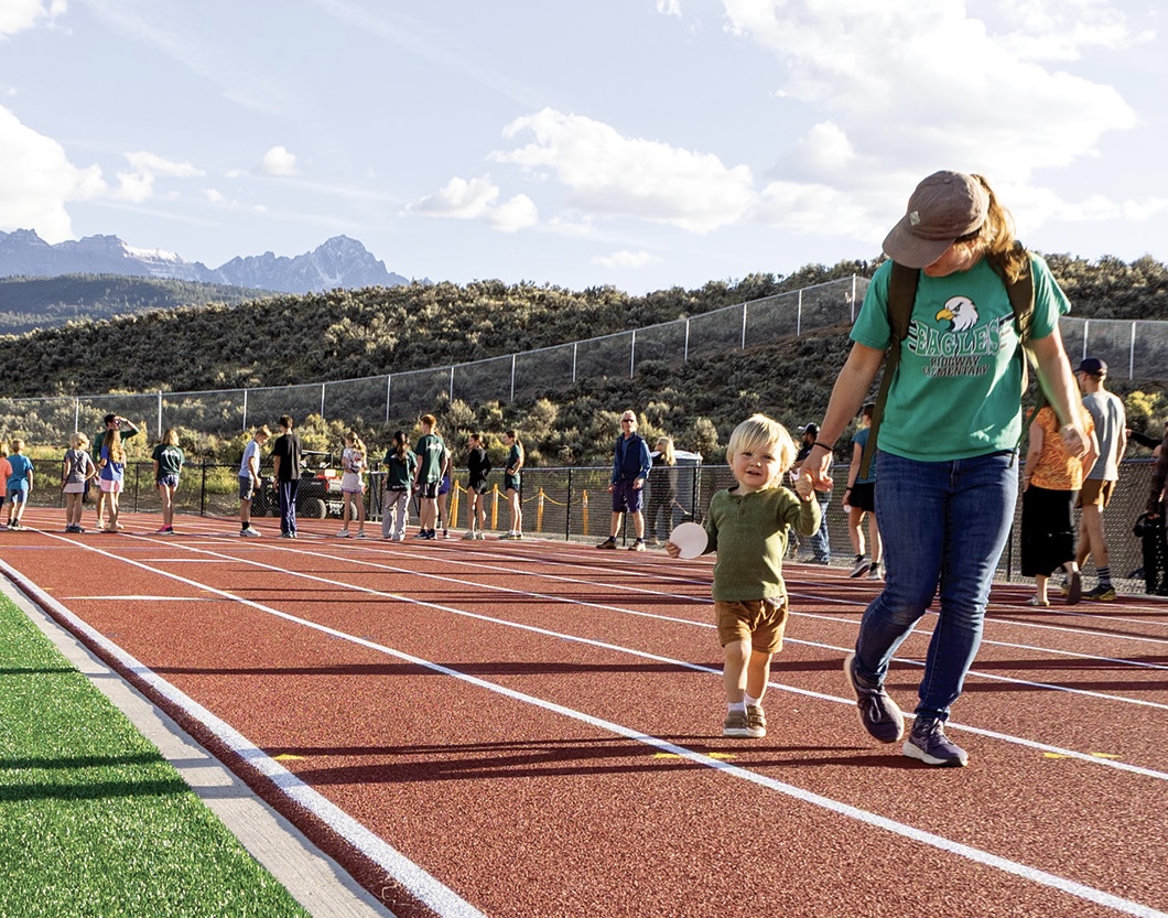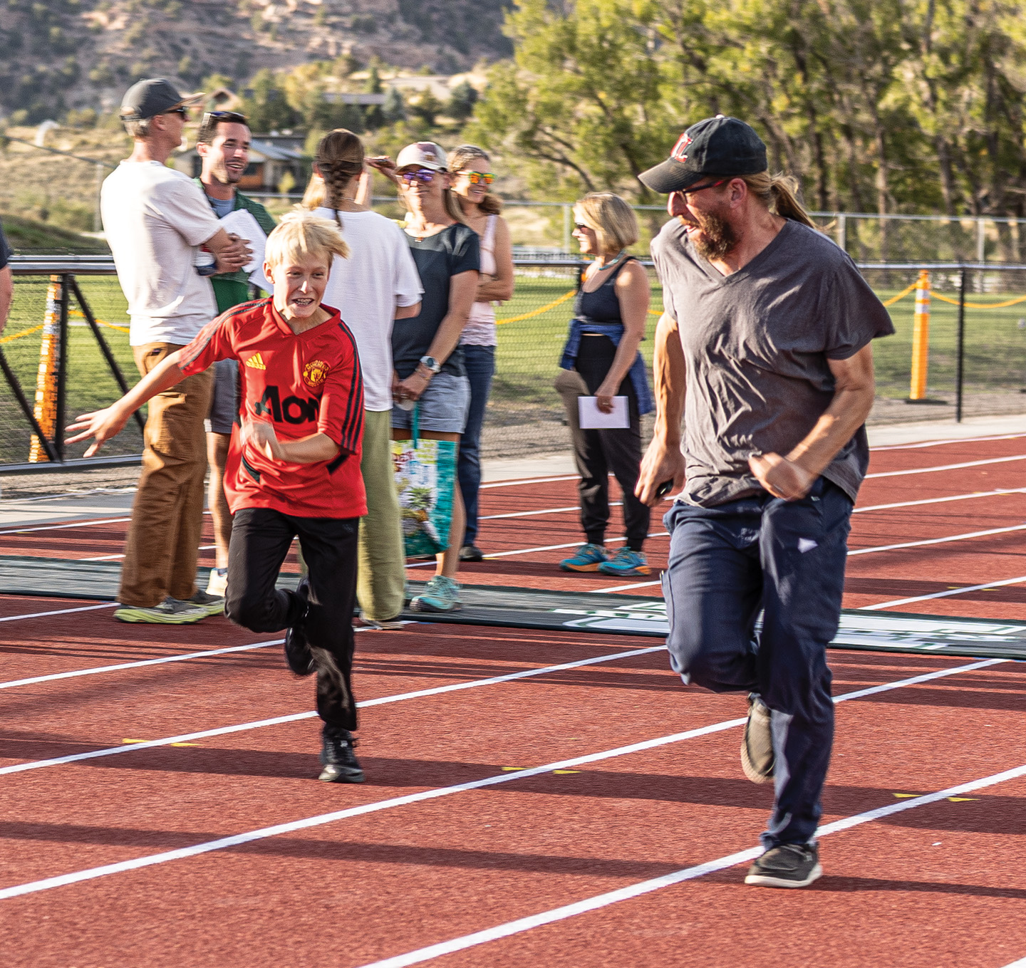 Hunter Patton, 12, races his dad, Brian, on the track at the new Cimarron Athletic Field after the ribbon cutting celebration on Monday night. Brian Patton serves on the Ridgway School Board and was part of the committee that worked to build the project. Erin McIntyre – Ouray County Plaindealer