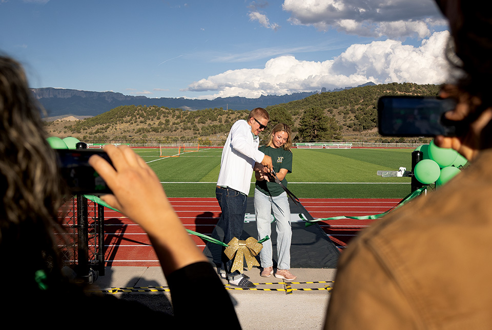 Ridgway Secondary School students Henry Deppen and Sophia Scranton cut the ribbon during the dedication ceremony for the new Cimarron Athletic Field project on Monday night. Erin McIntyre – Ouray County Plaindealer