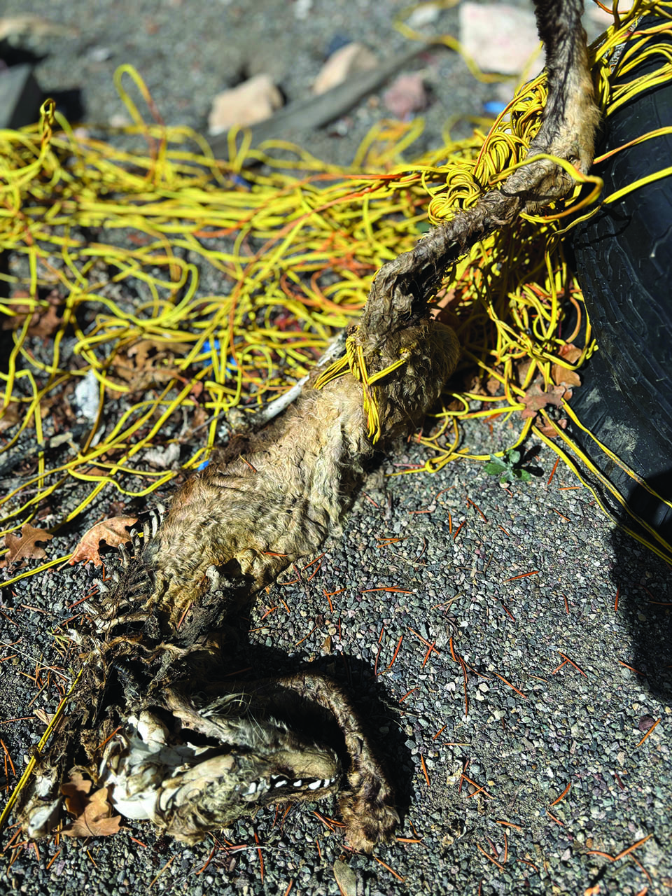 This photo, taken Oct. 7, shows the animal that became ensnared in the electrical cord used to set off the fireworks and died. It appears to be a fox but has decomposed significantly. Tourists who hiked to the spot above town for a better vantage point found the garbage and the dead animal. Mike Wiggins – Ouray County Plaindealer