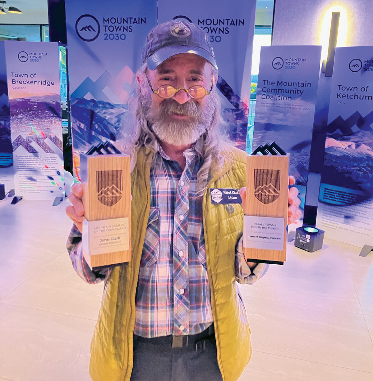 The Town of Ridgway and Mayor John Clark were both recognized at the Mountain Towns 2030 Climate Solutions Summit last week in Breckenridge, with awards for leadership and innovation. The organization represents a group of mountain, rural and ski town communities working to reduce climate change.