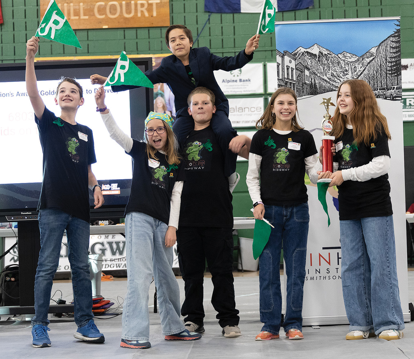 The Ridgway School District’s Lego Robotics team took home the first place champion’s award and first place for achieving the highest mission points during the regional qualifying competition held at Ridgway on Nov. 15. Pictured here, from left to right, are RoboRidgway team members Sawyer Mullins, Sadie McCracken, Eli Strength (on top), Jamison Lee, Nela Kereshi and Emma Birck. They are all sixth graders and they also attended the state competition on Dec. 6. Results were not available for the state competition. Photo and information submitted by Amy Strength