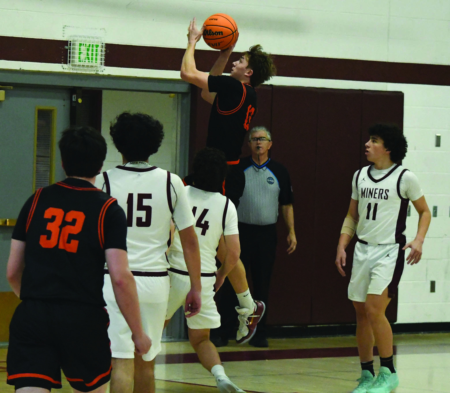 Ouray senior Keaton Nelson (13) leaps for a close-range shot over Telluride’s Langston Silbergeld (14) and others during the Trojans’ 56-52 victory on Feb. 28 in Telluride. Sitting in second place in the 3A/2A/1A San Juan Basin League with an 8-4 record, Ouray (14-8 overall) will face De Beque at 2 p.m. Friday, March 6, in the Class 1A state championship opening Round of 32 in Nucla. Ouray is the No. 18 seed entering the Nucla-hosted, four-team 1A-Region II event. De Beque is the No. 15 seed. Second-seeded Nucla will face 31-seed Kit Carson at 6 p.m. Friday. The winners of those two games will play Saturday at 1:30 p.m. Photo by Joel Priest/Special to the Plaindealer